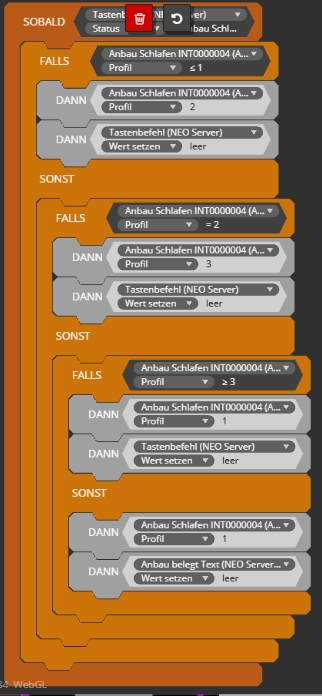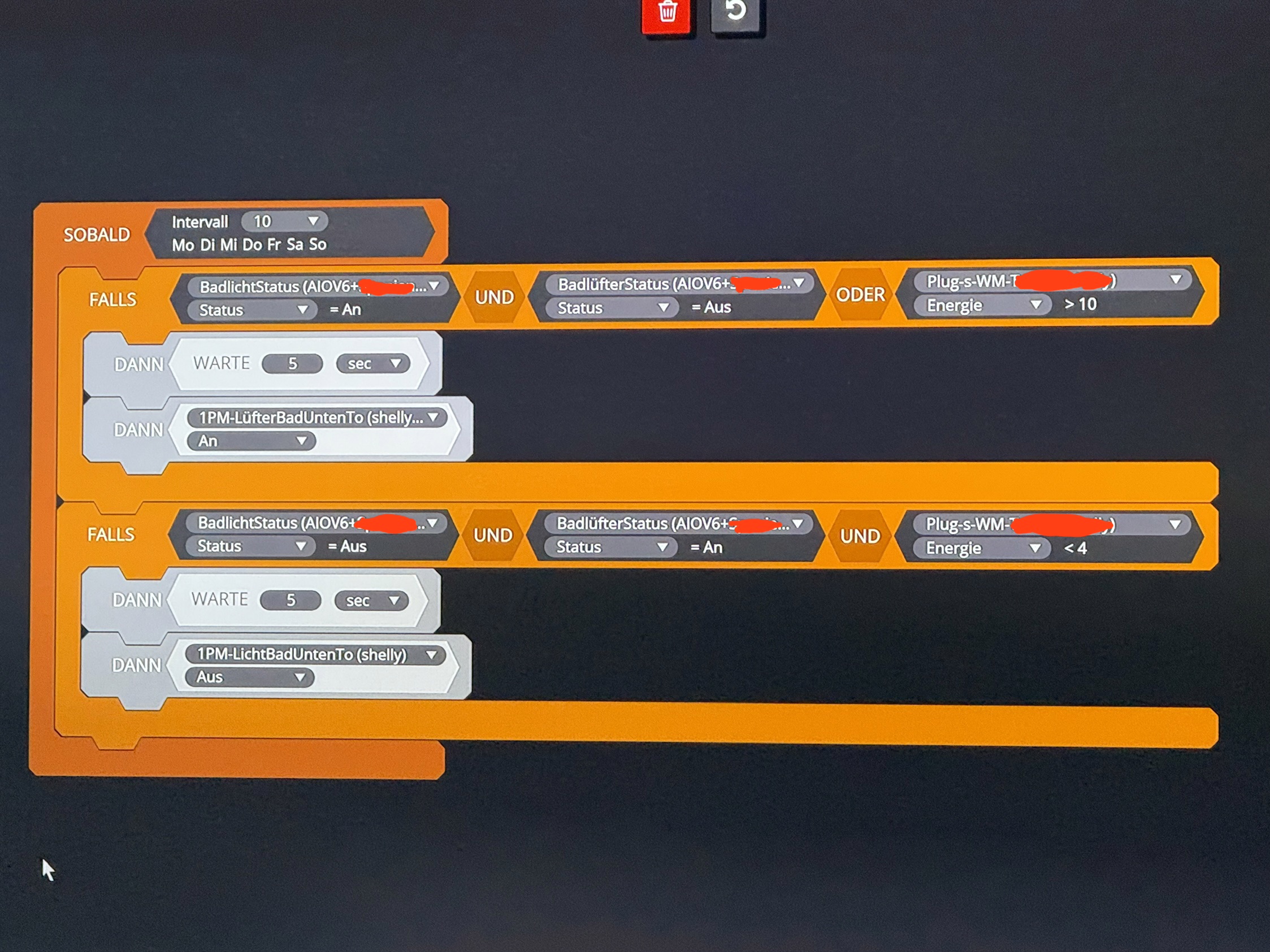 Der erste "Falls"Block funktioniert. Sobald ich das Bad Licht einschalte, oder die Waschmaschine läuft, schaltet 5 Sekunden später der Bad Lüfter ein.